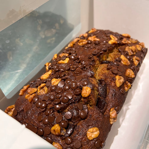 our rich banana loaf filled with french dark chocolate, topped off with Walnuts and more chocolate chocolate